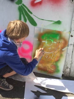 Keith heeft een muur. En wij mogen die volspuiten. Eerst maken we sjablonen en dan ontwerpen we elk onze eigen ’tag’.